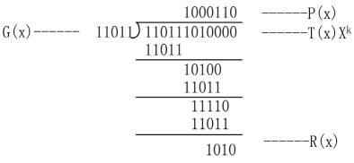 循环冗余校验码(亦称CRC码)在通信信号校错里广泛使 用。其基本原理是,在发送端:将要发送的数据串序列当作 一个多项式T(x)的系数(比如,多项式为T(x)=x5+x3+x+1,则 此多项式的系数就为101011,同时可以自定义一个k次幂的 称为生成多项式的多项式G(x),为了使原来的数据串序列在 后面加入校验码,就必须使其向左移,所以用Xk乘以T(x), 根据对二进制乘法的理解,得到的T(x)Xk,能起到把T(x) 原有数据串序列向左移动k位的结果。为了得到校验码,用 G(x)作除数,T(x)Xk作被除数,相除得到一个余数多项式 R(x)。然后将余数多项式R(x)并在待发送的数据串序列后 面,把这串新的数据串序列作为发送序列发送。在接收端: 再次使用自定义的生成多项式G(x)去除接收到的数据串序列多项式,如果相除所得到的余数多项式和在发送端计算得到的余数多项式相同,则表示信号传输正常,没有出现差错;