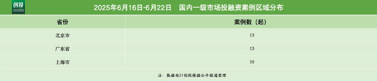 从披露获投企业的地域分布来看,本周的融资地区主要集中在北京市、广东省和上海市。北京市和广东省各完成13笔融资,上海市完成10笔融资。