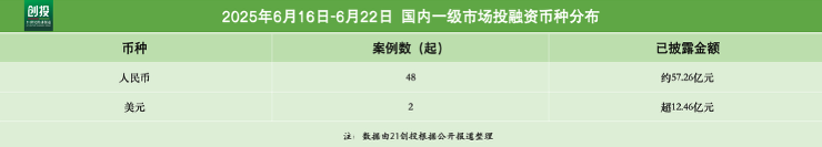 21创投不完全统计,6月16日—6月22日,报告日期内国内一级市场发生融资事件60起。其中,有50笔融资披露了融资金额和币种信息,总规模约人民币69.72亿元。