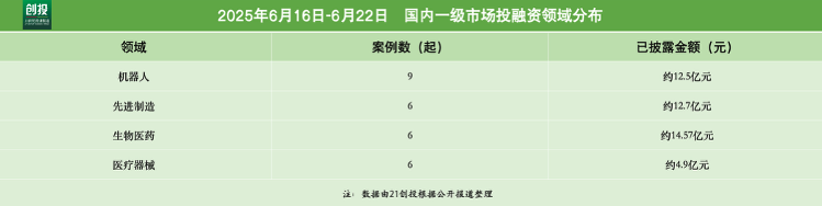 本周融资数量最多的依旧是科技与制造行业。在行业领域的诸多赛道中,机器人完成9笔融资,披露融资额约12.5亿元人民币;先进制造完成6笔融资,赛道内披露融资金额约12.7亿元人民币。医疗健康行业,生物医药和医疗器械赛道各完成6笔融资,披露融资金额约14.57亿元人民币和4.9亿元人民币。