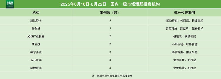 从机构投资活跃度来看,本周深毅达资本和创新投各完成3笔融资。光谷产业投资、苏创投、浦东基金、基石资本和尚欣资本完成2笔融资。